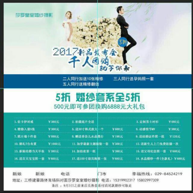 • 小屁孩翻唱 2017-08-11 西安未央、莎罗皇室婚纱摄影 2017年夏季高定主题发布会👇👇婚纱照十八项豪礼等你来拿[得意] [强]恋水晶婚纱服送!仅50套💃 [强]婚纱照订单五折优惠[红包] [强]婚纱照拍一套送三套⚡ [强]2017上海展会新款服装免费穿👔👗👠[强]送……🤑空前绝后‼️