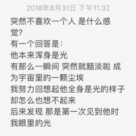 突然不喜欢一个人 是什么感觉? 有一个回答是: 他本来浑身是光 有那么一瞬间 突然就黯淡啦 成为宇宙里的一颗尘埃 我努力回想起他全身是光的样子 却怎么也想不起来 后来发现 那是第一次见到他时 我眼里的光