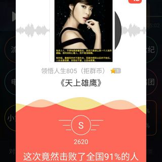 亲们早上好!好久没发歌了,今天将这首田震的原唱(逍遥游)献给可爱的亲们,希望大家喜欢。我唱的这首歌打败了全国100%的人,快来听听吧。