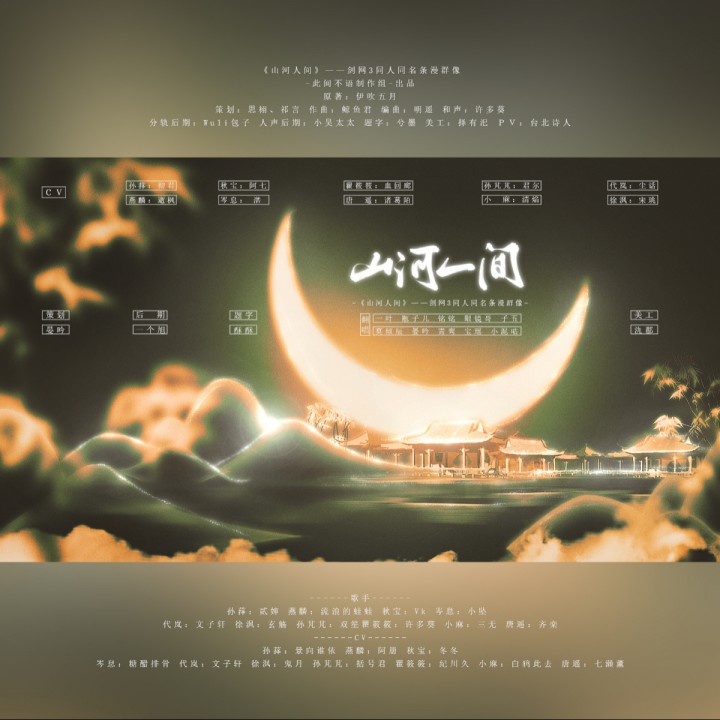 《山河人间》——剑网3同人同名条漫群像。曲:鲸鱼君,翻策:晏吟,美工:氿郡,题字:酥酥,后期:一个旭,歌手:一叶 ,瓶子儿,铭铭,眼睛哥,子五,莫倾辰,晏吟,青鸾,宝瑶,小泥咕,cv:彻君,逝枫,阿七 ,湛 ,尘话 ,宋珧,君尔 ,血回廊,清焰,诸葛陌#怦然心动的瞬间#