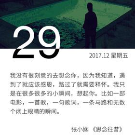我没有很刻意的去想念你,因为我知道,遇到了就应该感恩,路过了就需要释怀。我只是在很多很多的小瞬间,想起你。比如一部电影,一首歌,一句歌词,一条马路和无数个闭上眼睛的瞬间。 ——张小娴 《思念往昔》