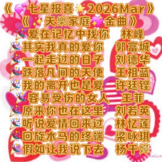 《💞七星报喜🌟2026Mar》《✨天樂家庭💖金曲》🌹🎉爱在记忆中找你 林峰🎉其实我真的爱你 郭富城🎉一起走过的日子 刘德华🎉跌落凡间的天使 王祖蓝🎉我的离开也是爱 许廷铿🎉容易受伤的女人 王菲🎉原来你也在这里 刘若英🎉听说爱情回来过 林忆莲🎉回旋木马的终端