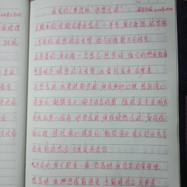 #玩转共创#社长历年来创作粤语歌词收集篇。我爱的人粤语版″仍想念妳″创作时间最初起稿于:2001年11月18日。这首歌我26年前写的,写给我曾暗恋的人而且好喜欢的人Mⅰss杨的。如果歌友和声的话,你唱你的国语就行了,粤国合壁!