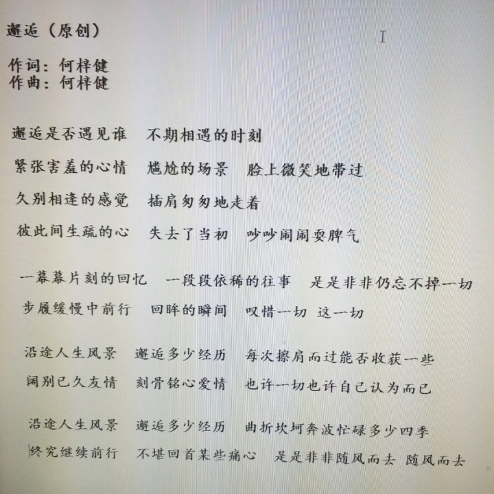 歌曲清唱作品第三首《邂逅(原创)》!词曲作者:何梓健。给大家欣赏,望大家喜欢,多多支持!